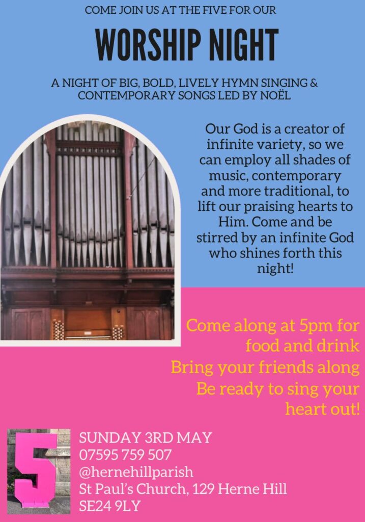On Sunday, as well as our usual services, at 5 at St Paul’s we are having a Worship night of big, bold, lively hymn singing and contemporary songs, led by Noël Tredinnick. Everyone is welcome to come along, even if you usually don’t attend the Five.